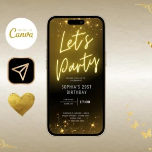 Neon Gold Light Digital Party e-invite Template, Birthday Text Message Interactive invitations